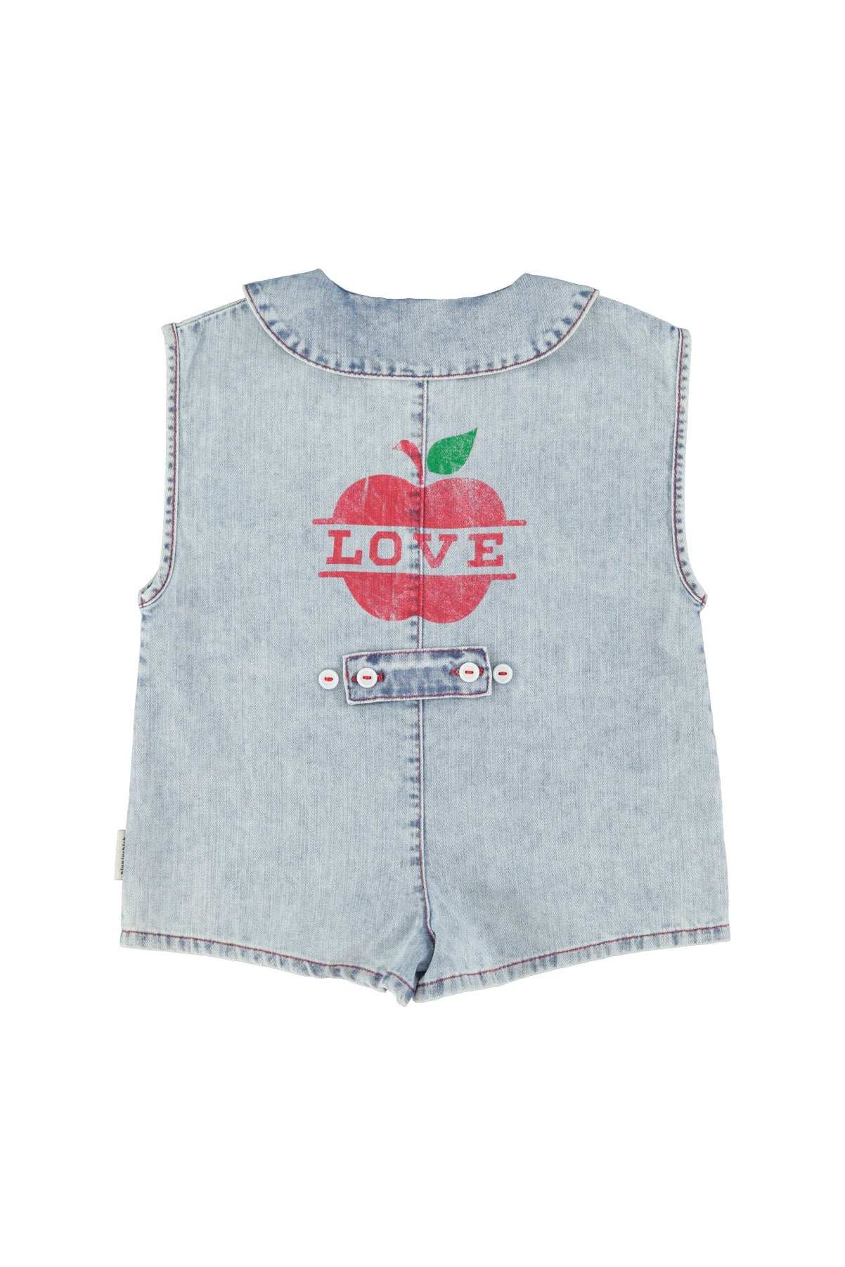 Kombinezon z kołnierzykiem w kolorze jasnego jeansu z nadrukiem jabłka na plecach.