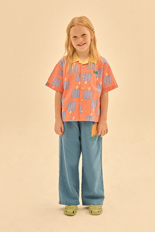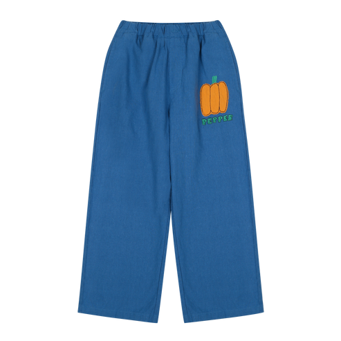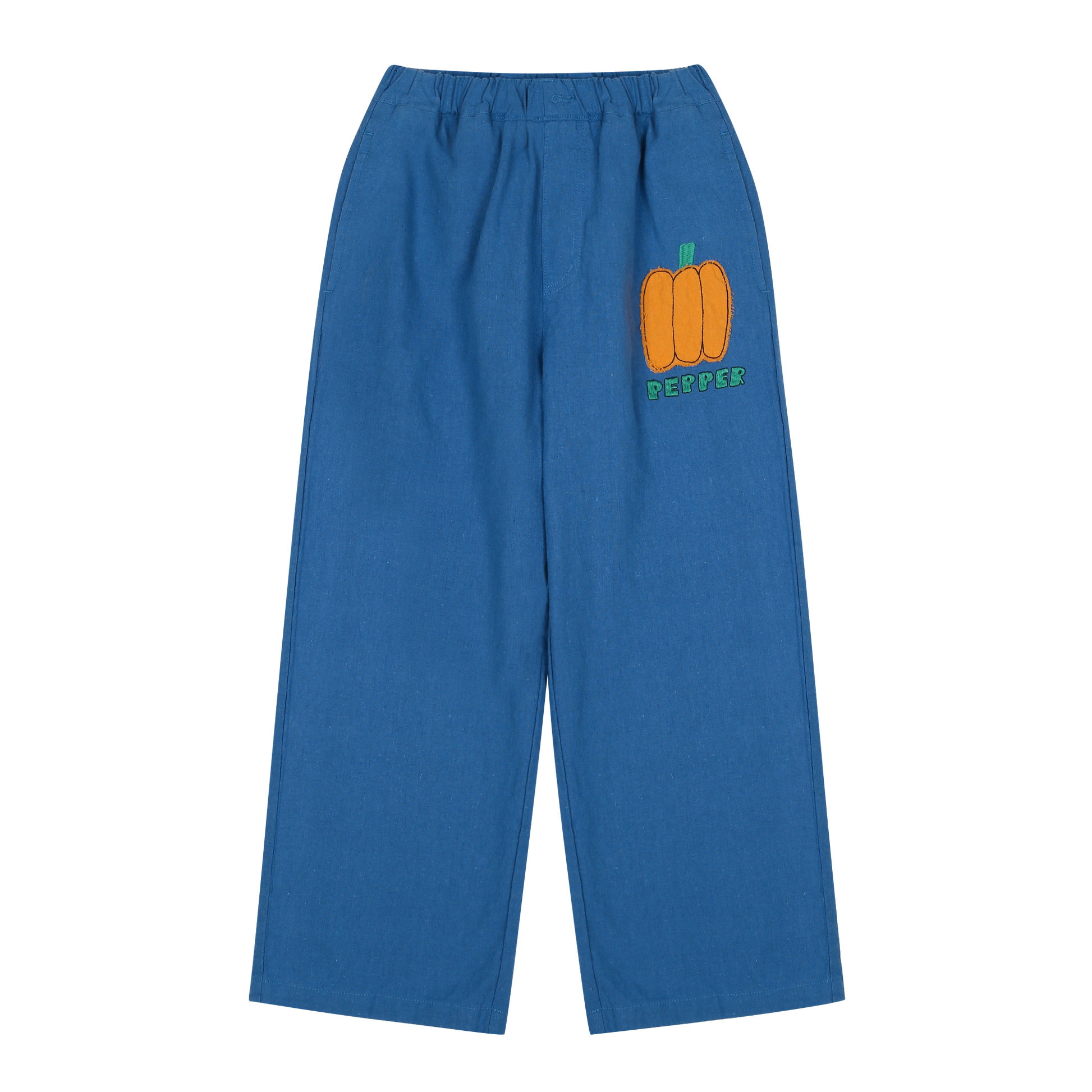 Lniane niebieskie spodnie ozdobione pomarańczową papryką na lewej nogawce.