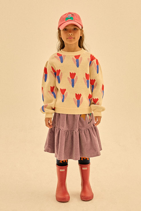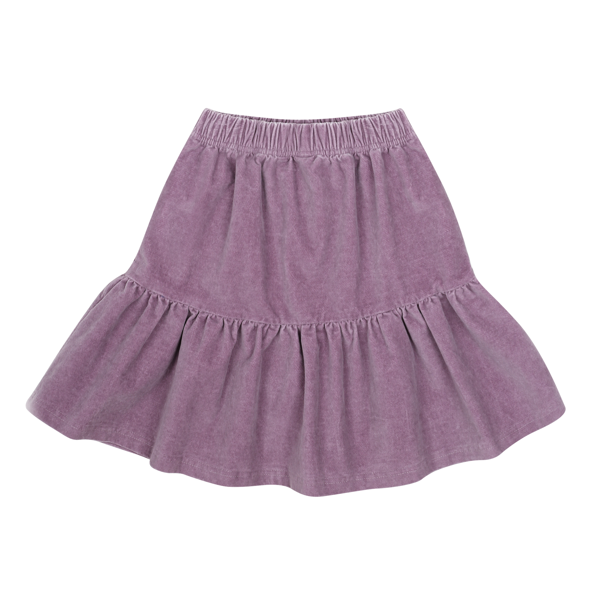 Fioletowa spódnica z falbaną i kolorową aplikacją.
