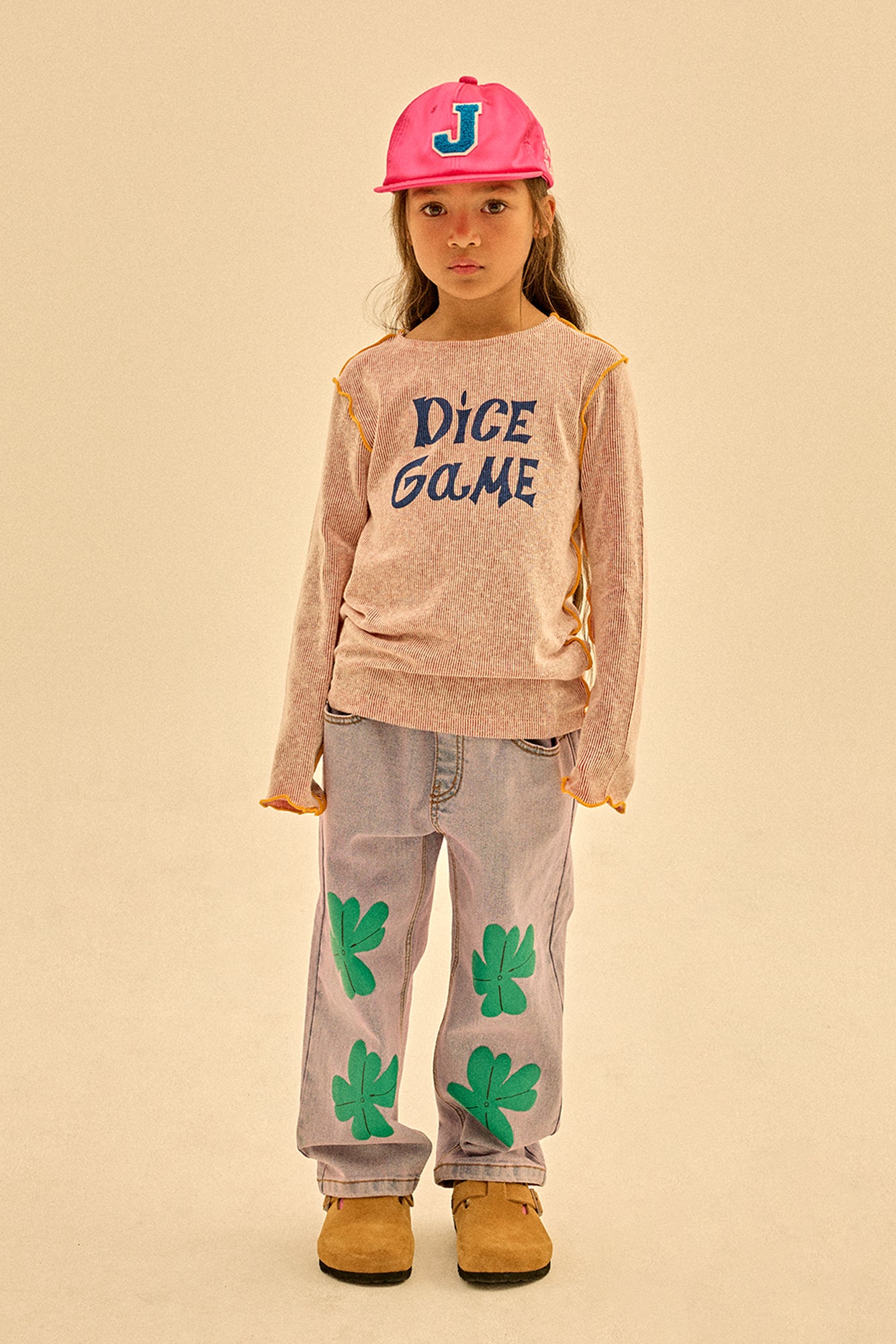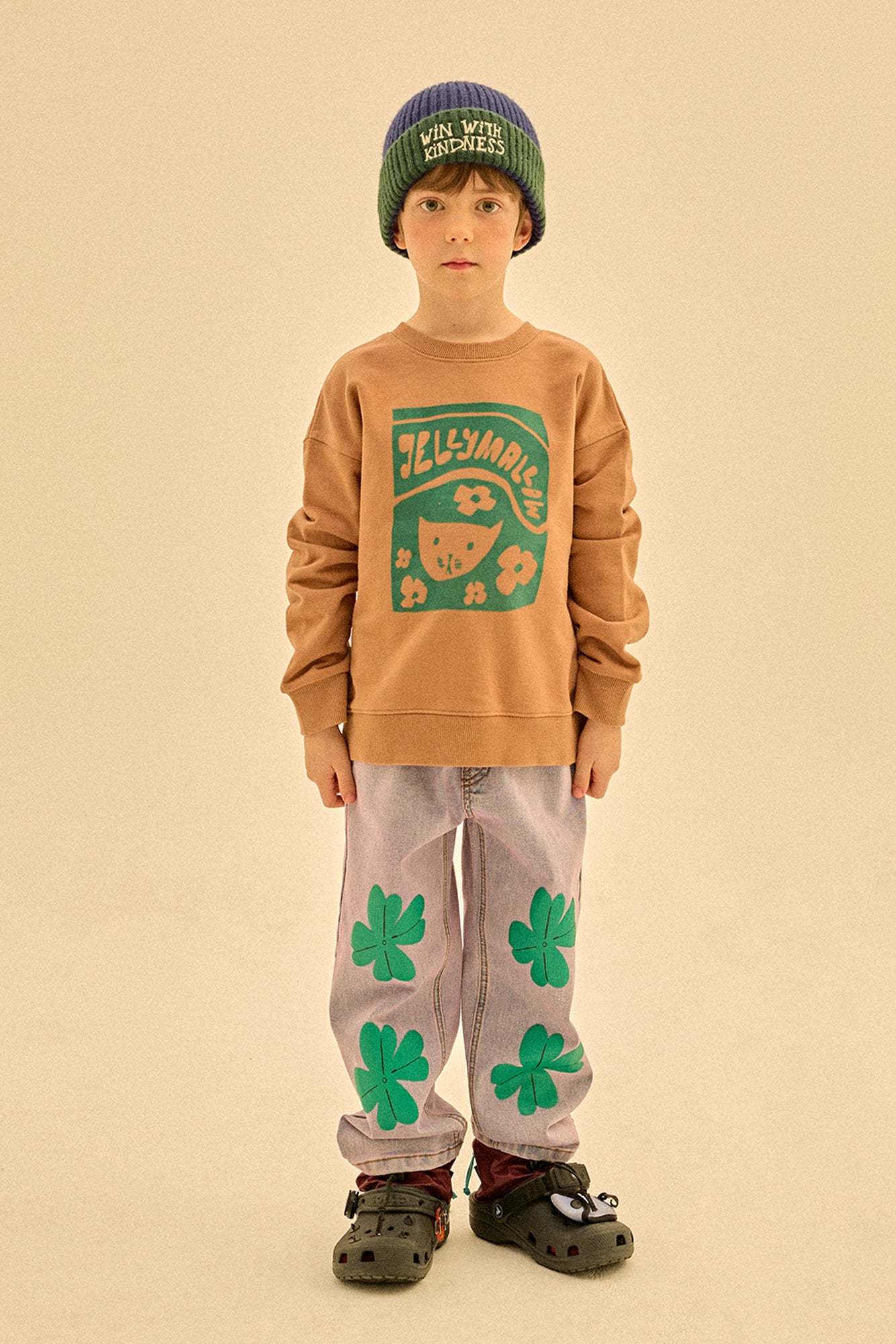 Fioletowe jeansy z nadrukowanymi na nogawkach czterolistnymi koniczynami.