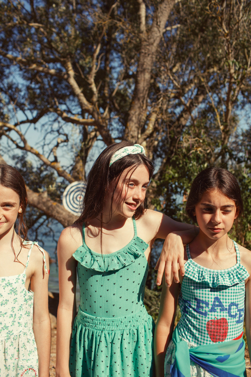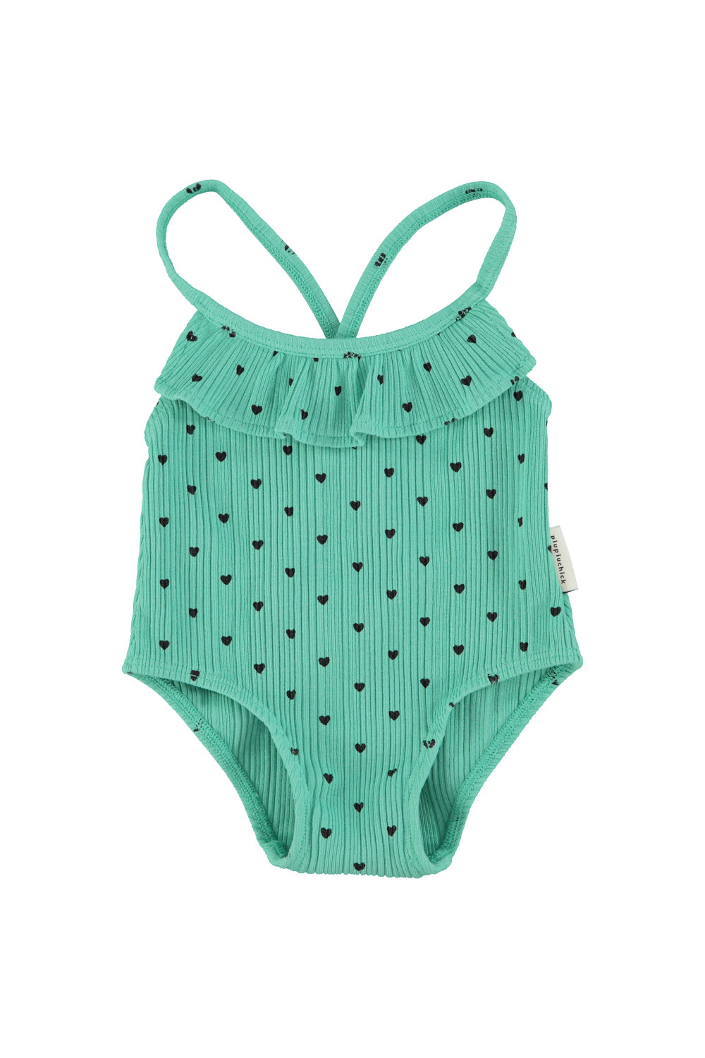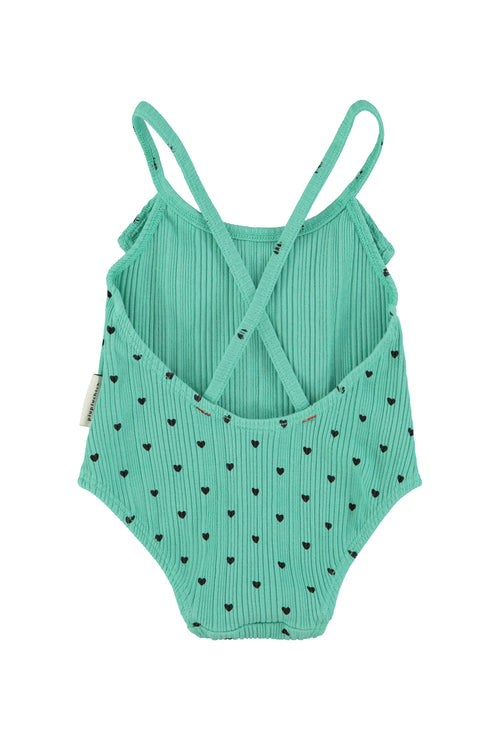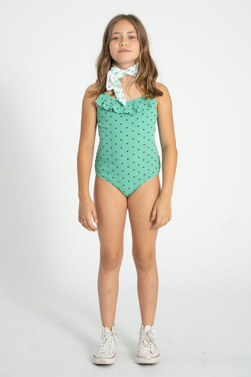 Strój kąpielowy z falbanką | green w/ black hearts allover