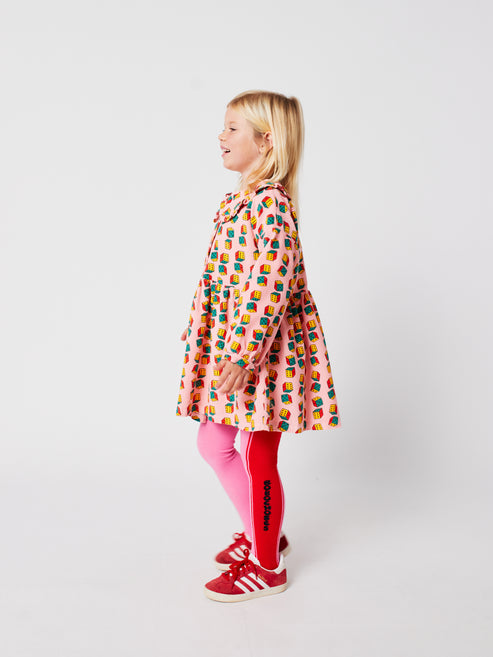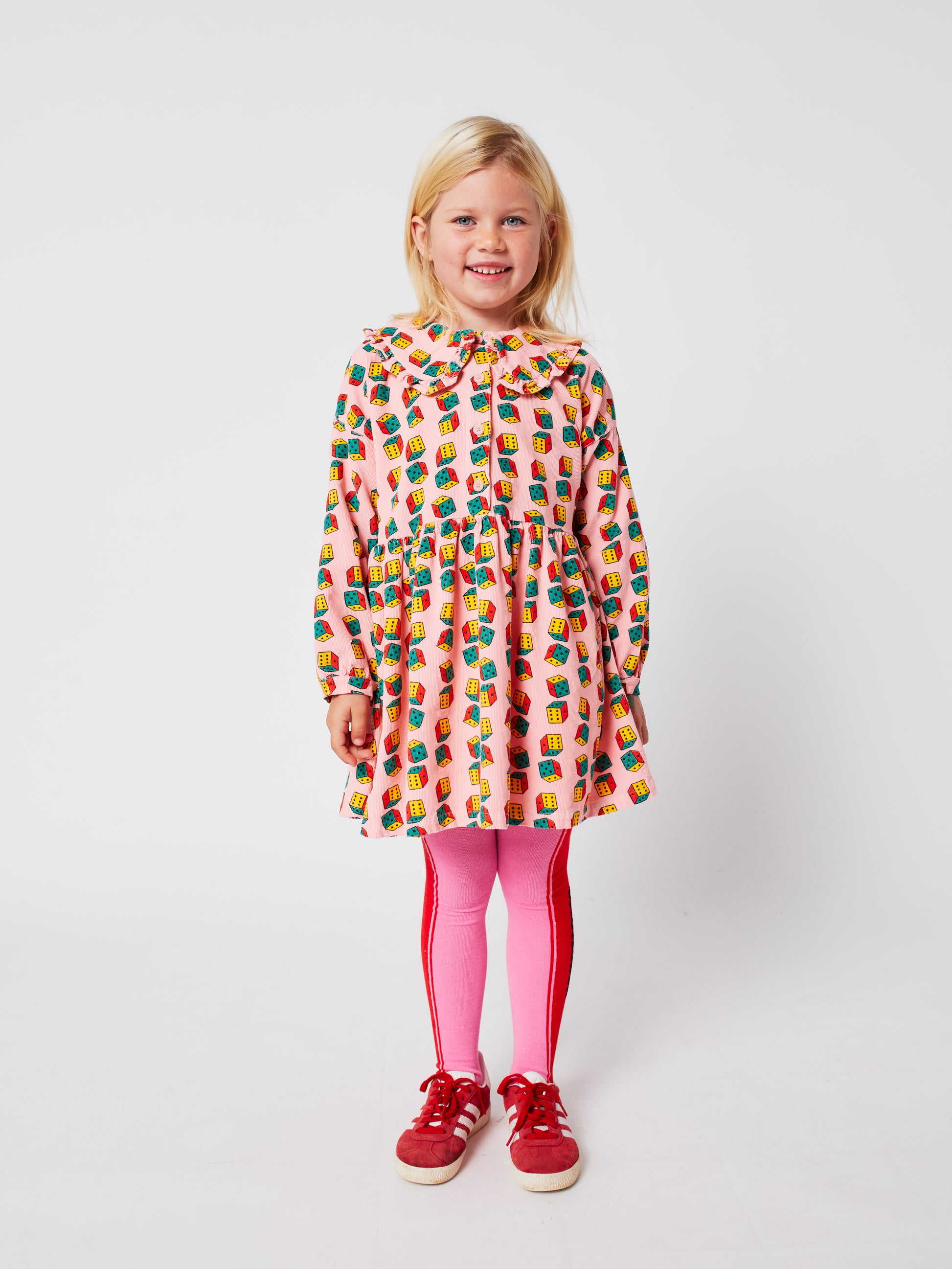 Różowa sukienka we wzór kolorowych kostek do gry na całej powierzchni. Sukienka ma okrągły kołnierzyk wykończony małą falbanką. Zapinana jest z przodu na guziczki. Jest odcięta w pasie, dół jest zmarszczony. Sukienka uszyta jest w drobnego sztruksu.