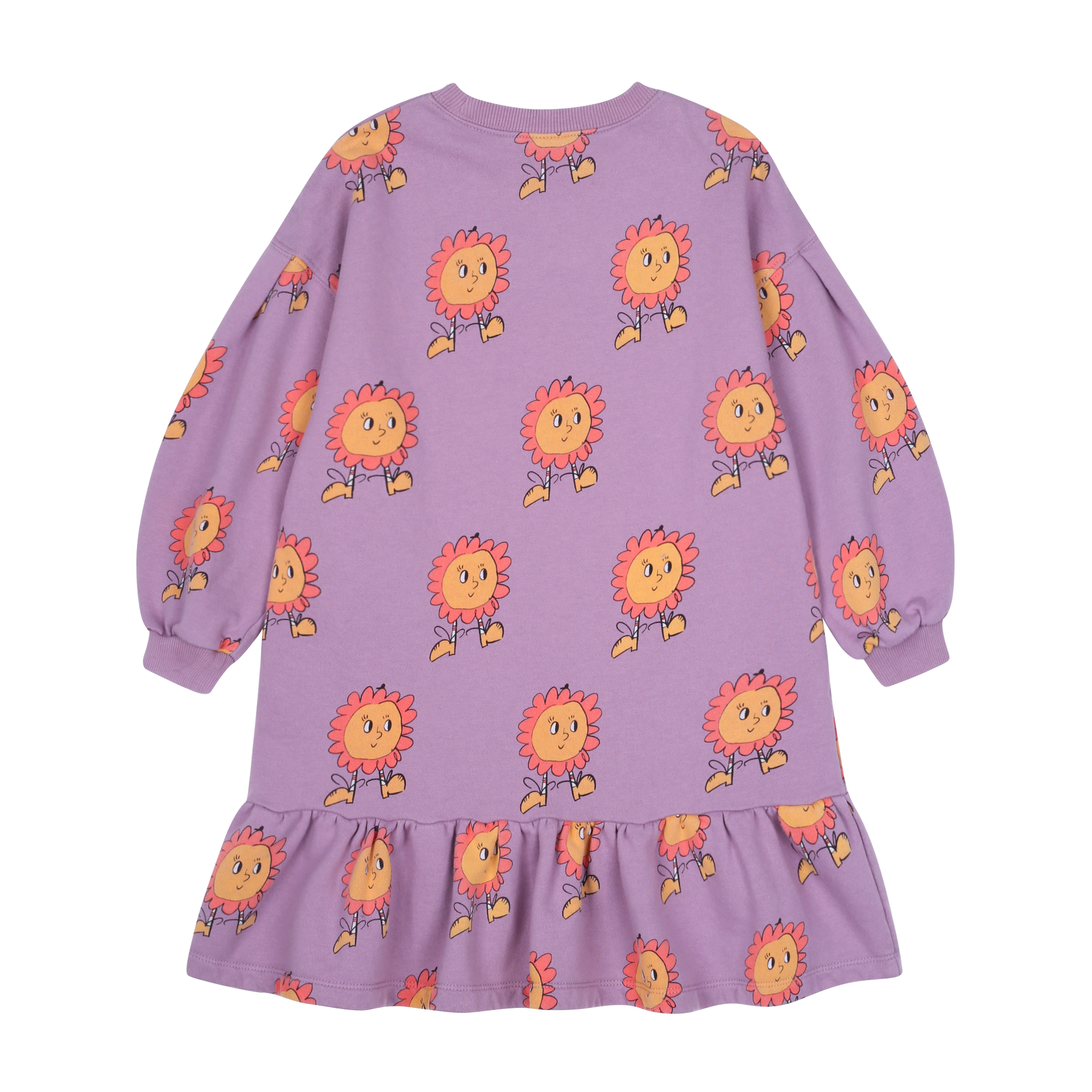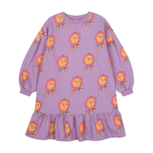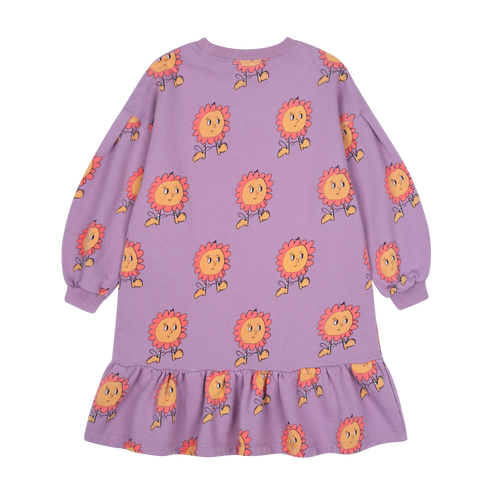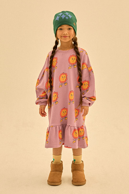 Sukienka z długim rękawem we wzór wesołych słoneczników. Ozdobiona falbaną.