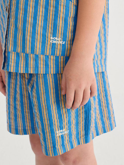Bermudy w niebiesko-beżowe pionowe paski. Mają elastyczny pas, boczne wpuszczane kieszenie i mały haft na lewej nogawce